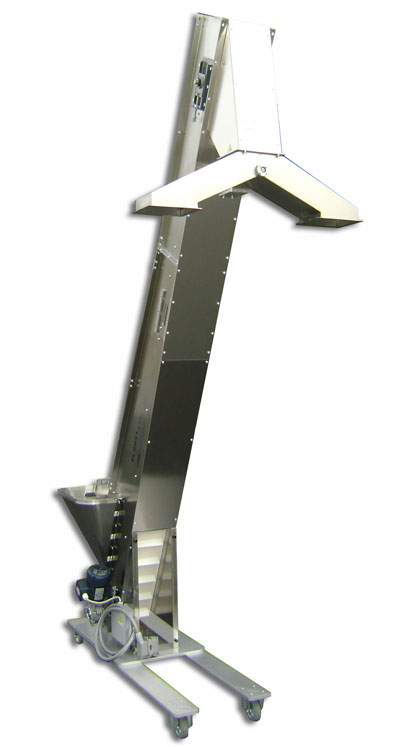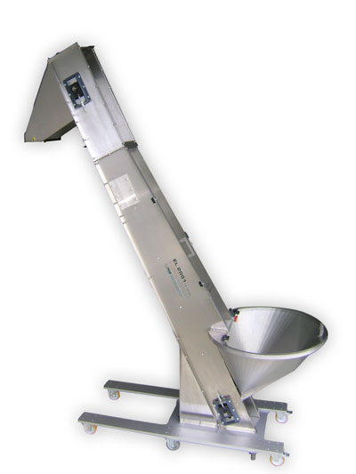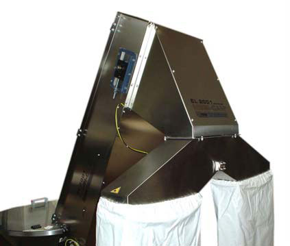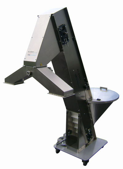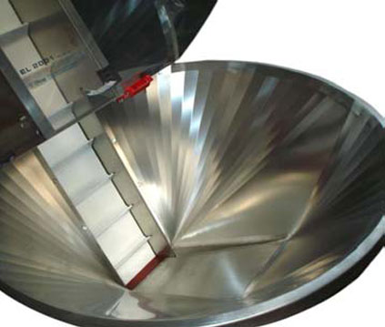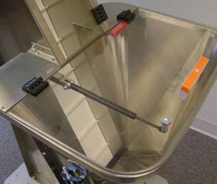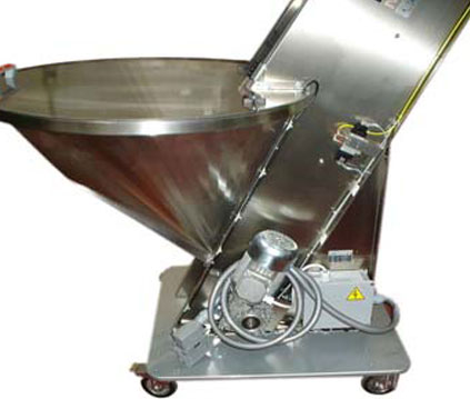 Stainless Steel hopper bowl with hinged polycarbonate cover and quick change part access panel below.